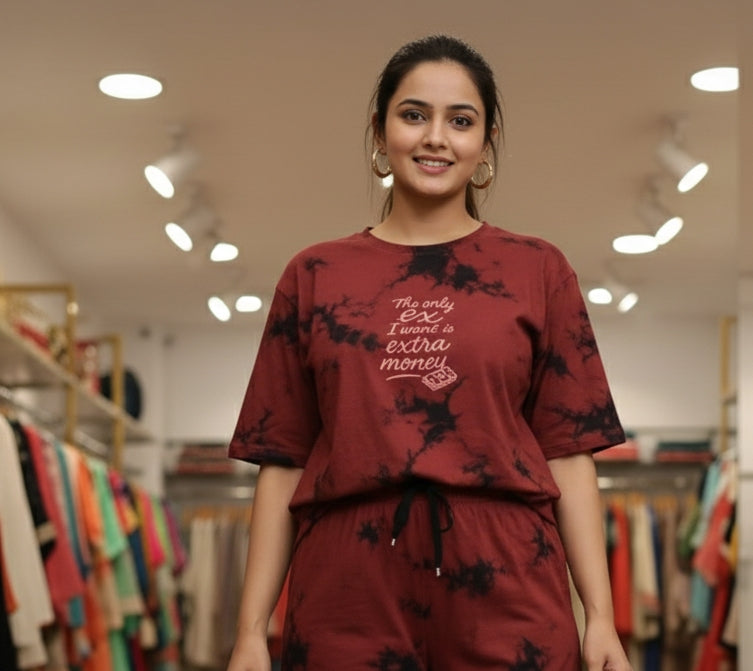 This coordinated set features a rich burgundy and black tie-dye pattern. The oversized t-shirt is emblazoned with a playful graphic quote, adding a touch of personality to your casual wardrobe. Paired with matching Bermuda-style shorts, this set offers a complete, effortless look.