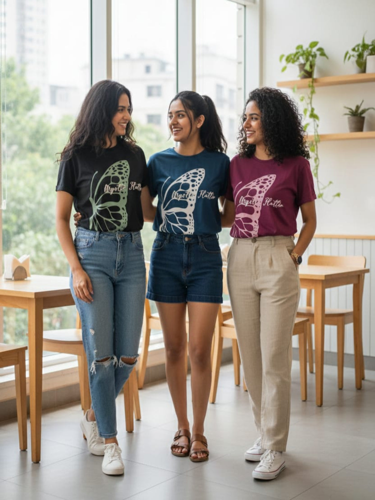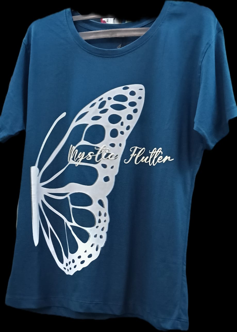 Product Descriptions & Color Specifications: Butterfly Graphic TrioThree t-shirts featuring a central butterfly motif, available in diverse sophisticated tones.Teal Blue Plum Purple